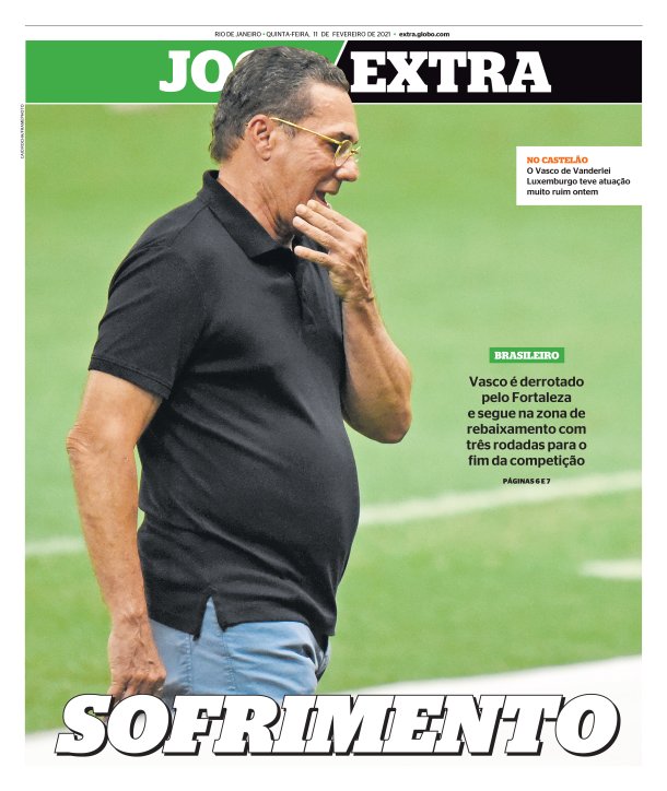 Pelo Campeonato Brasileiro, o Vasco perdeu para o Fortaleza por 3 a 0 na noite da última 4ª-feira, no Castelão, aumento suas chances de rebaixamento. Veja as capas dos jornais.