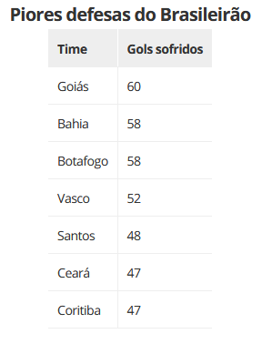 Nessas sete goleadas sofridas, no entanto, o Vasco levou 25 dos 52 gols, quase 50% das vezes em que foi vazado em todo Brasileirão. Hoje, o clube tem a quarta pior defesa da competição, à frente somente de Goiás (60), Botafogo (58) e Bahia (58).