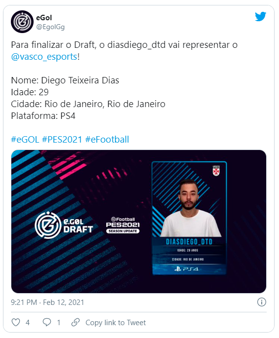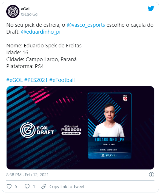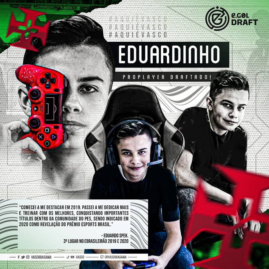 EDUARDINHO É DO VASCO! O player @eduardinho_pr foi draftado e é um dos atletas a compor o nosso trio oficial que disputará o @egol.gg, torneio realizado em parceria da Konami e Rede Globo. Com pouca idade, porém muita bagagem no cenário nacional, o e-atleta vem para somar em qualidade técnica e experiência!