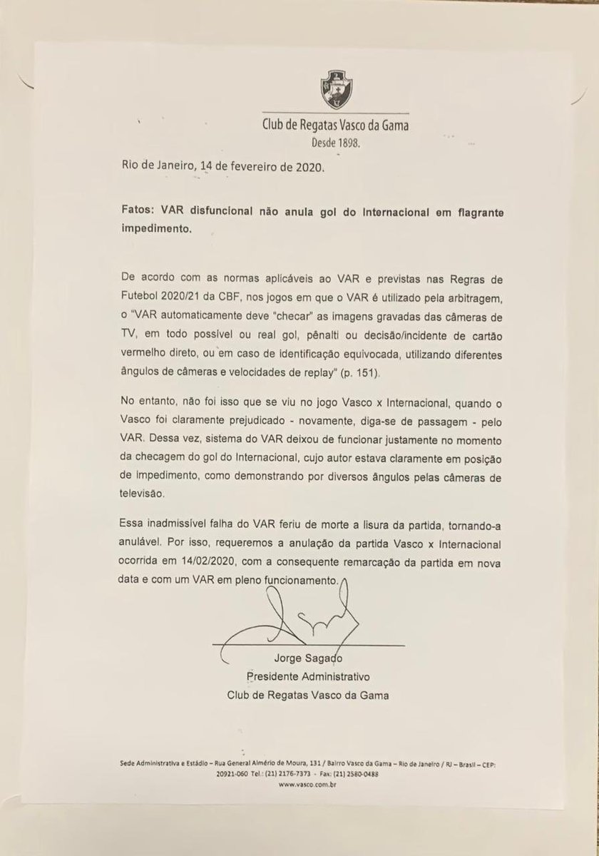 Ofício protocolado pelo presidente Jorge Salgado expondo os erros da arbitragem e solicitando a anulação da partida.