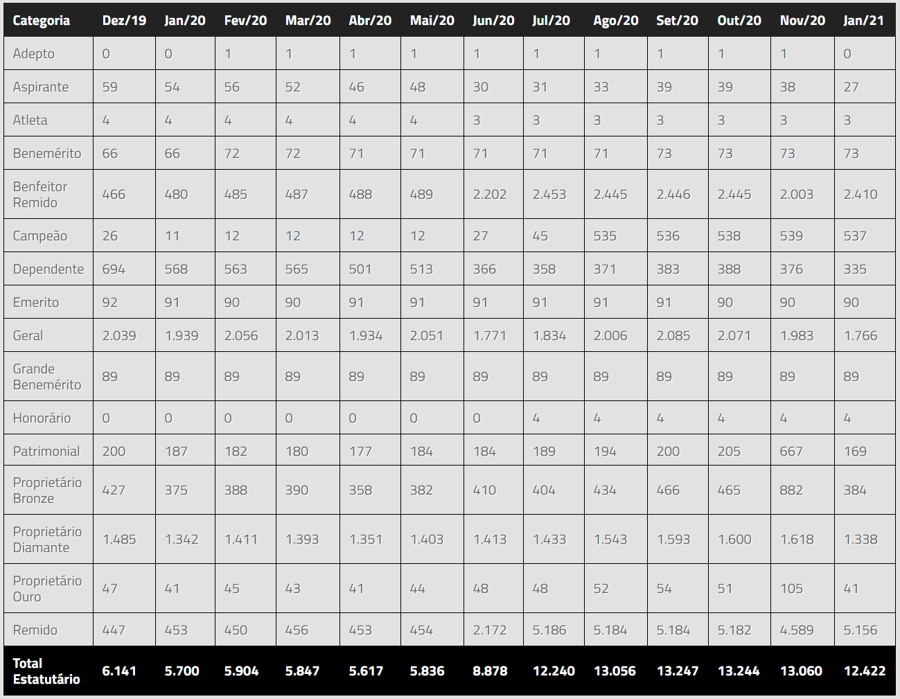Veja abaixo a quantidade de sócios ativos no Gigante por categoria.