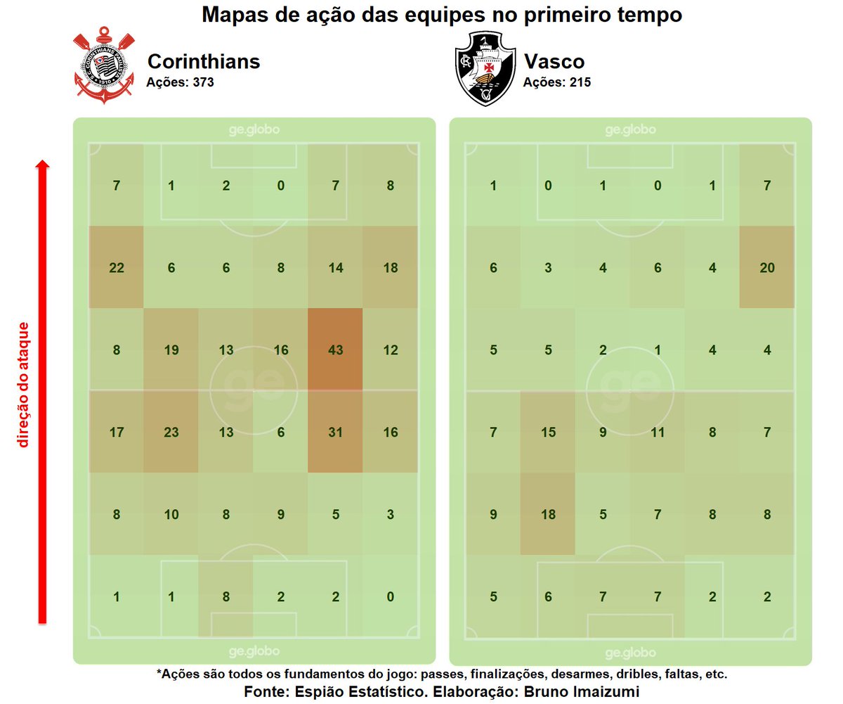 Os mapas de ação de Corinthians e Vasco no 1ºT resumem o jogo até aqui: o Corinthians controla as ações na zona intermediária, mas chega pouco na área adversária. Já o Vasco, quando tem a bola, praticamente só atacou pelo lado direito, hoje com apoio de Pikachu #trarenacor