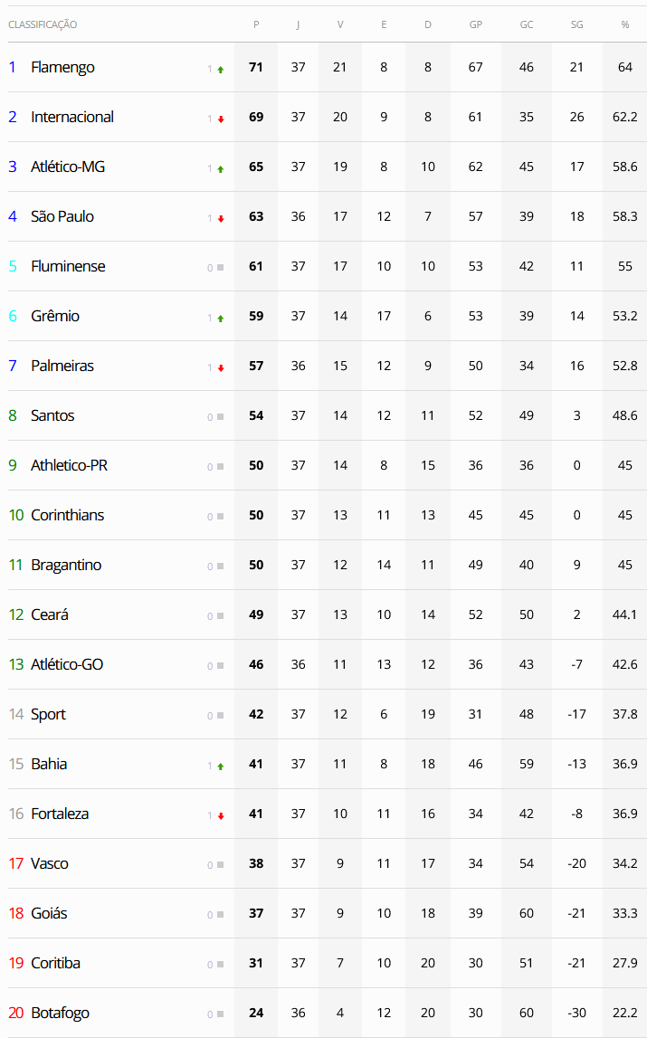 Veja a classificação do Brasileiro após os jogos de domingo da 37ª rodada; Vasco está virtualmente rebaixado