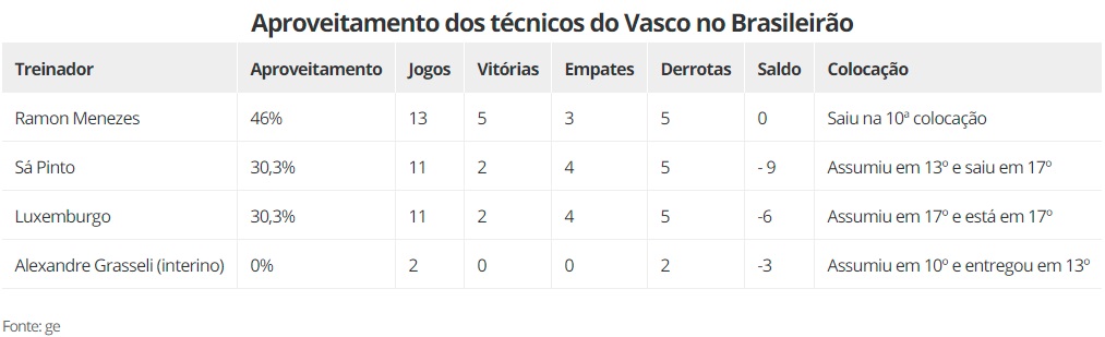 Luxemburgo iguala aproveitamento de Sá Pinto e não supera o de Ramon; Vasco teve 3 técnicos em cada queda