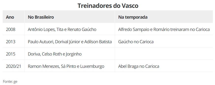 Em 2008, o Vasco teve Antônio Lopes, Tita e Renato Gaúcho. Cinco anos depois, os treinadores foram Paulo Autuori, Dorival Júnior e Adilson Batista. Em 2015, o time teve novamente três comandantes: Doriva, Celso Roth e Jorginho.