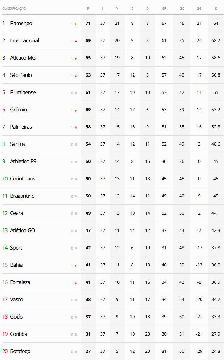 Veja a classificação do Brasileiro após a 37ª rodada; Vasco está em 17º lugar e virtualmente rebaixado