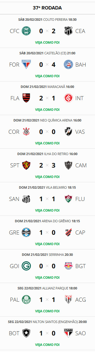 Terminada a 37ª e penúltima rodada do Brasileiro, veja como está a classificação. O Vasco está em 17º lugar e virtualmente rebaixado, pois, para se salvar, precisa ganhar do Goiás, torcer para o Fortaleza perder para o Fluminense e ainda descontar uma diferença de 12 gols de saldo em relação à equipe cearense.