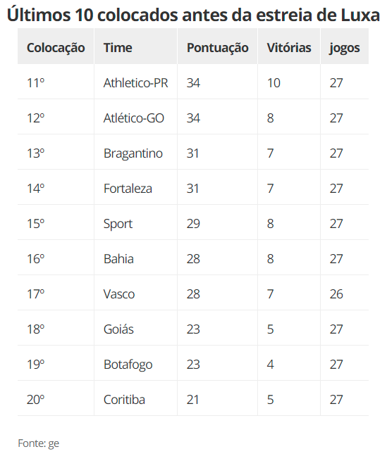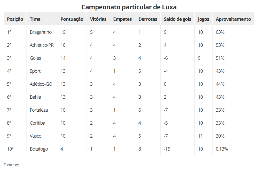 Na coletiva de apresentação, Luxa foi questionado sobre confrontos diretos, ou seja, duelos contra equipes da parte de baixo da tabela. Das 12 partidas, o Vasco enfrentaria sete equipes que estavam entre as dez últimas posições quando da estreia do treinador. O desempenho foi ruim: