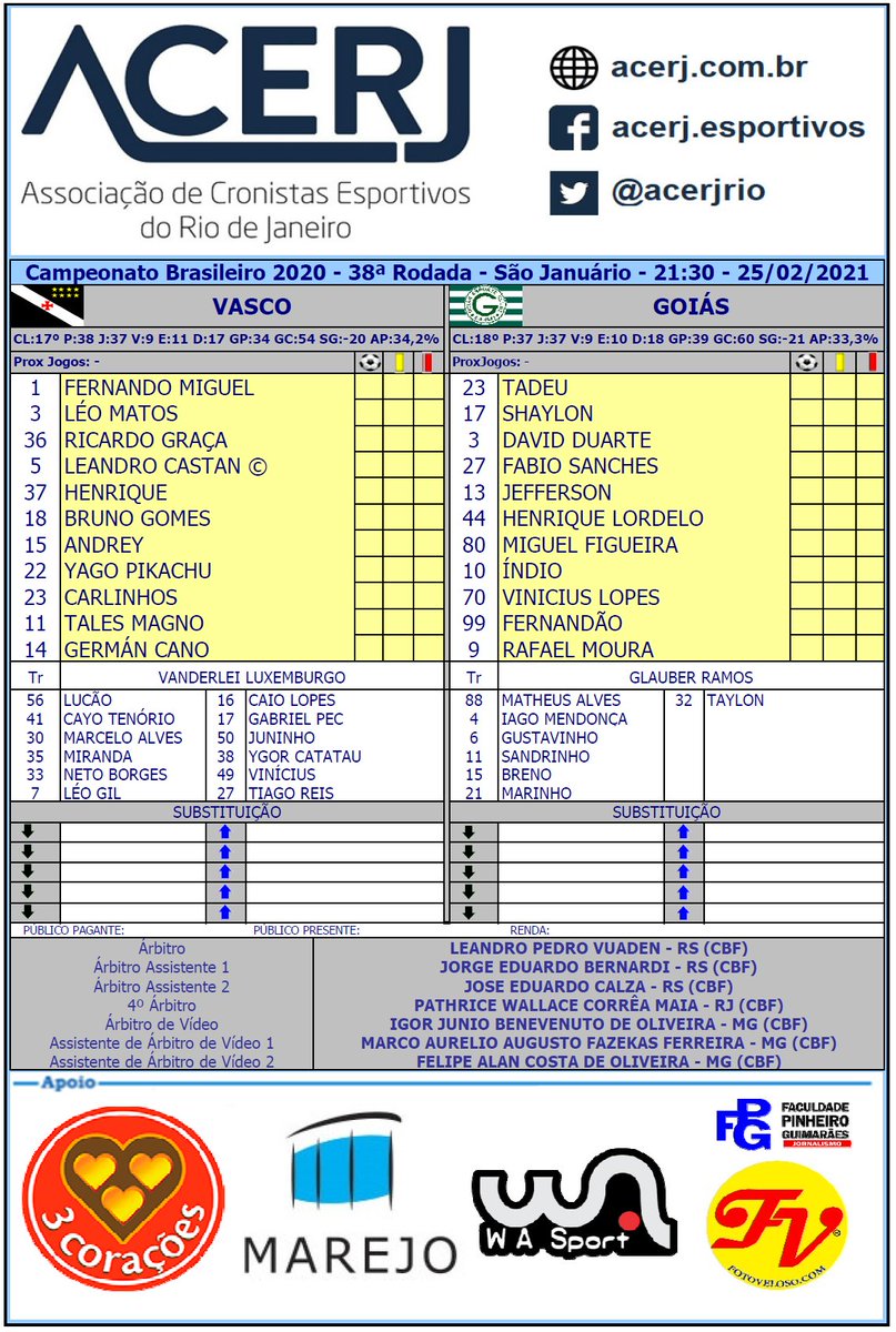 Escalações de Vasco e Goiás pela 38ª Rodada do Campeonato Brasileiro 2020 em São Januário #Brasileirao2020 #acerjinforma #VASxGOI