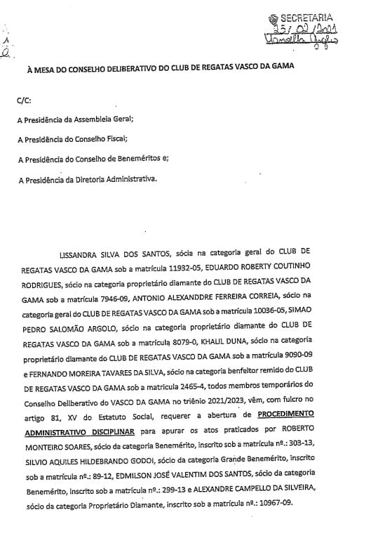 Conselheiros do Vasco da Gama solicitam abertura de procedimento administrativo disciplinar para apurar atos praticados por: