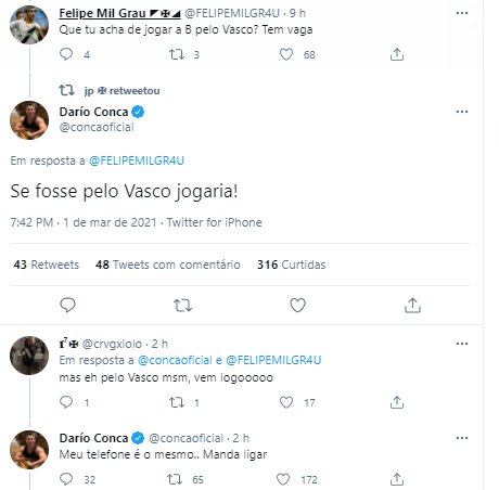 Na noite desta segunda-feira (01), o argentino Darío Conca respondeu um tweet de um torcedor vascaíno afirmando que jogaria a série B pelo o Vasco. Em sequência, ainda disse que o número dele é o mesmo, que é só ligar. Alguns torcedores responderam o comentário animados com a possibilidade.