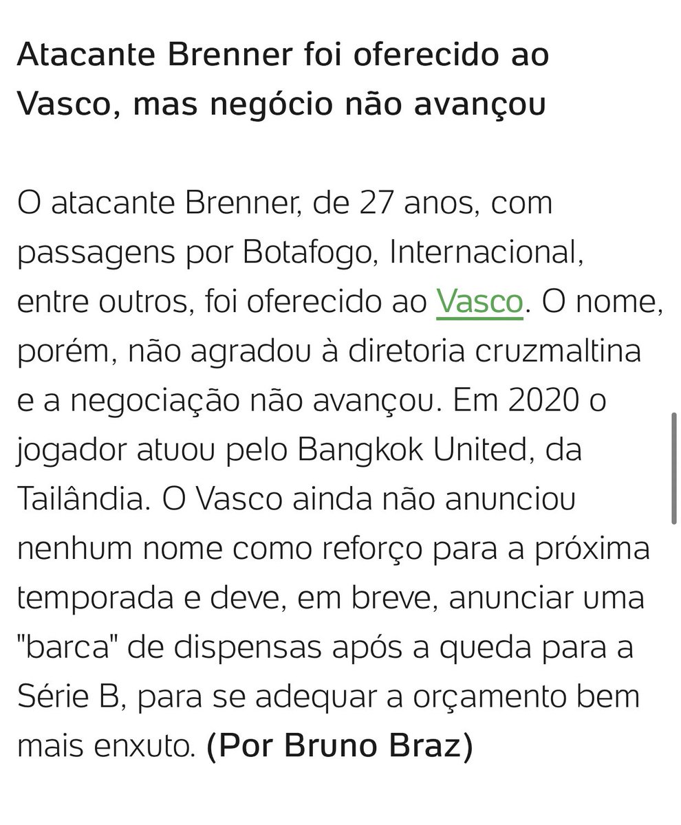 O atacante Brenner, ex-Botafogo e Inter, foi oferecido ao Vasco, mas o clube não demonstrou interesse e o negócio não avançou