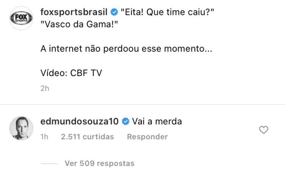 Perfil do Fox Sports ironiza o Vasco após queda de papel em sorteio e é xingado por Edmundo