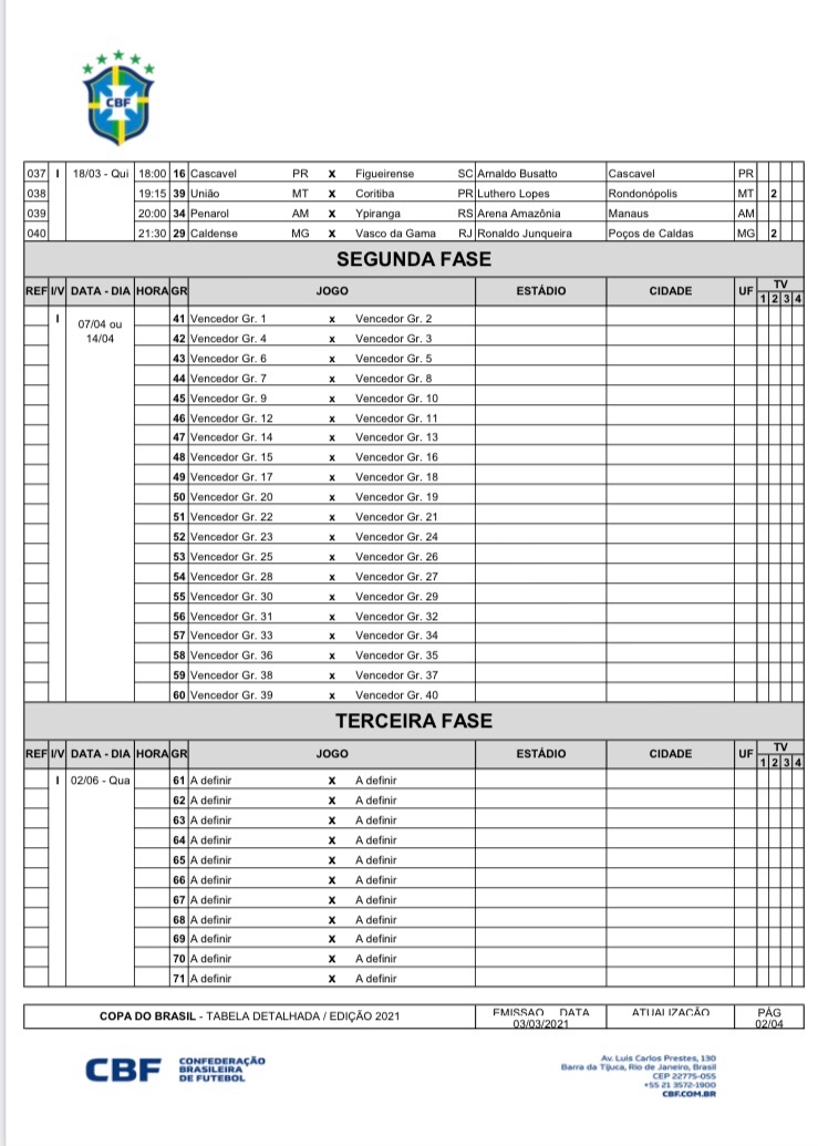 Caldense x Vasco, pela 1ª fase da Copa do Brasil, será no dia 18/03 às 21h30, com Sportv