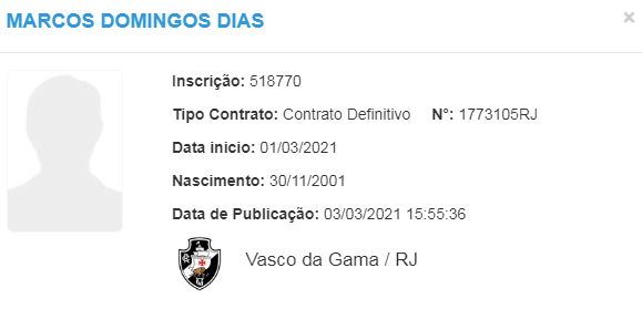 Foi publicado no BID da CBF a renovação do contrato do atacante Marcos Dias, de 19 anos, com o Vasco. Novo acordo vai até agosto de 2022. Marcos Dias está no grupo de atletas do sub-20 que disputam as primeiras rodadas do Carioca pelo Vasco. #VascoENM