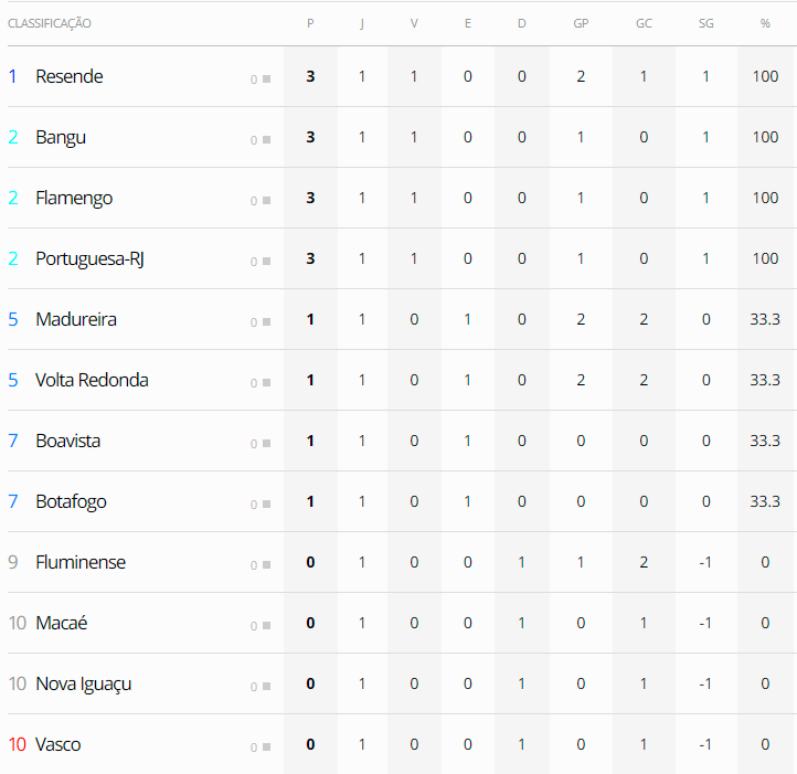 (Esclarecimento: Vasco e Macaé estão empatados em 10º lugar devido ao critério do menor número de cartões recebidos - cada um te um amarelo. O Nova Iguaçu está em 12º lugar porque recebeu 2 cartões amarelos.)