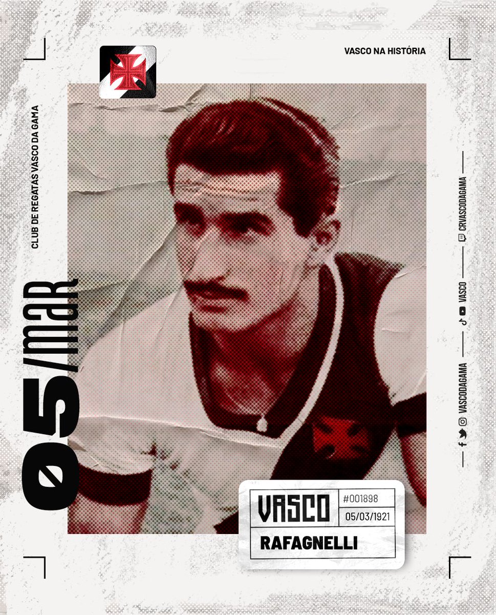 Há 100 anos, nascia o argentino Rafagnelli. Foi um dos zagueiros mais importantes que defendeu o Vasco. Atuou entre 1943 e 1948. Grande craque do Expresso da Vitória. Conquistou os Cariocas de 1945 e 1947 e o Sul-Americano de Campeões em 1948. ?