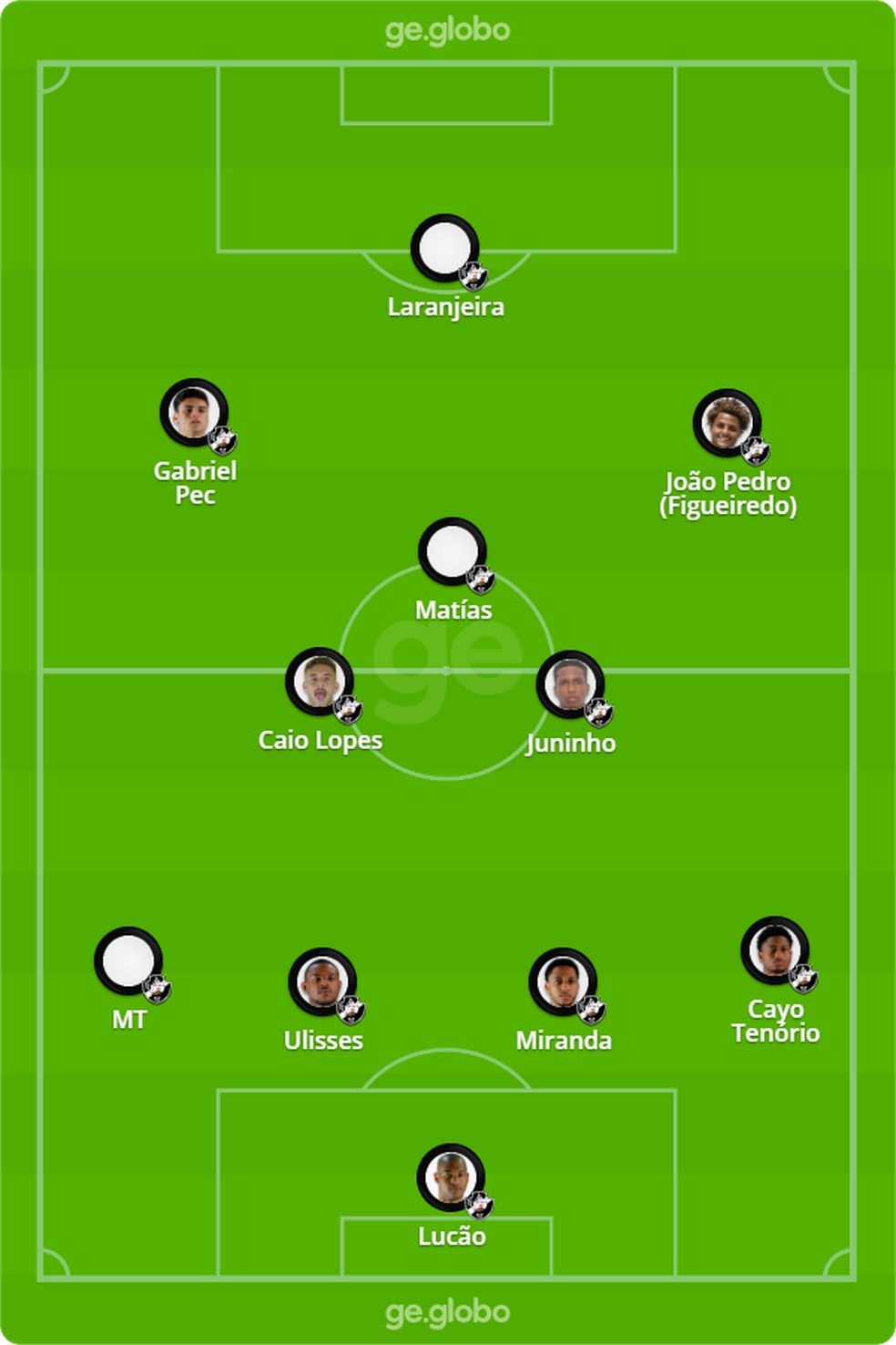 Time provável Lucão, Cayo Tenório, Miranda, Ulisses e MT; Caio Lopes, Juninho, Matías Galarza, João Pedro (Figueiredo) e Gabriel Pec; Laranjeira.: .