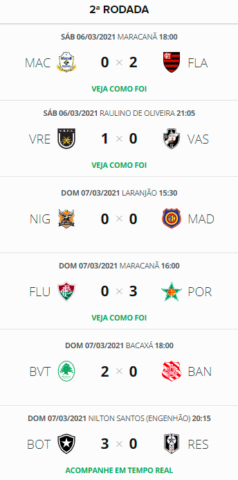 Terminados os jogos da 2ª rodada do Campeonato Estadual, o Vasco, que perdeu para o Volta Redonda por 1 a 0, segue na 10ª colocação da Taça Guanabara.