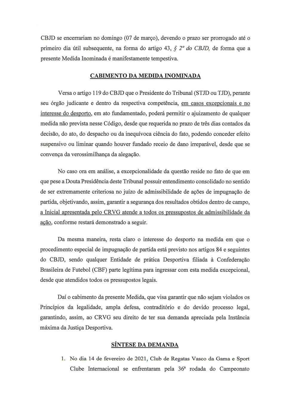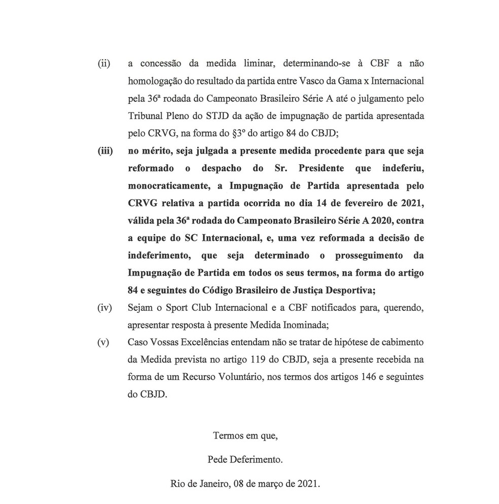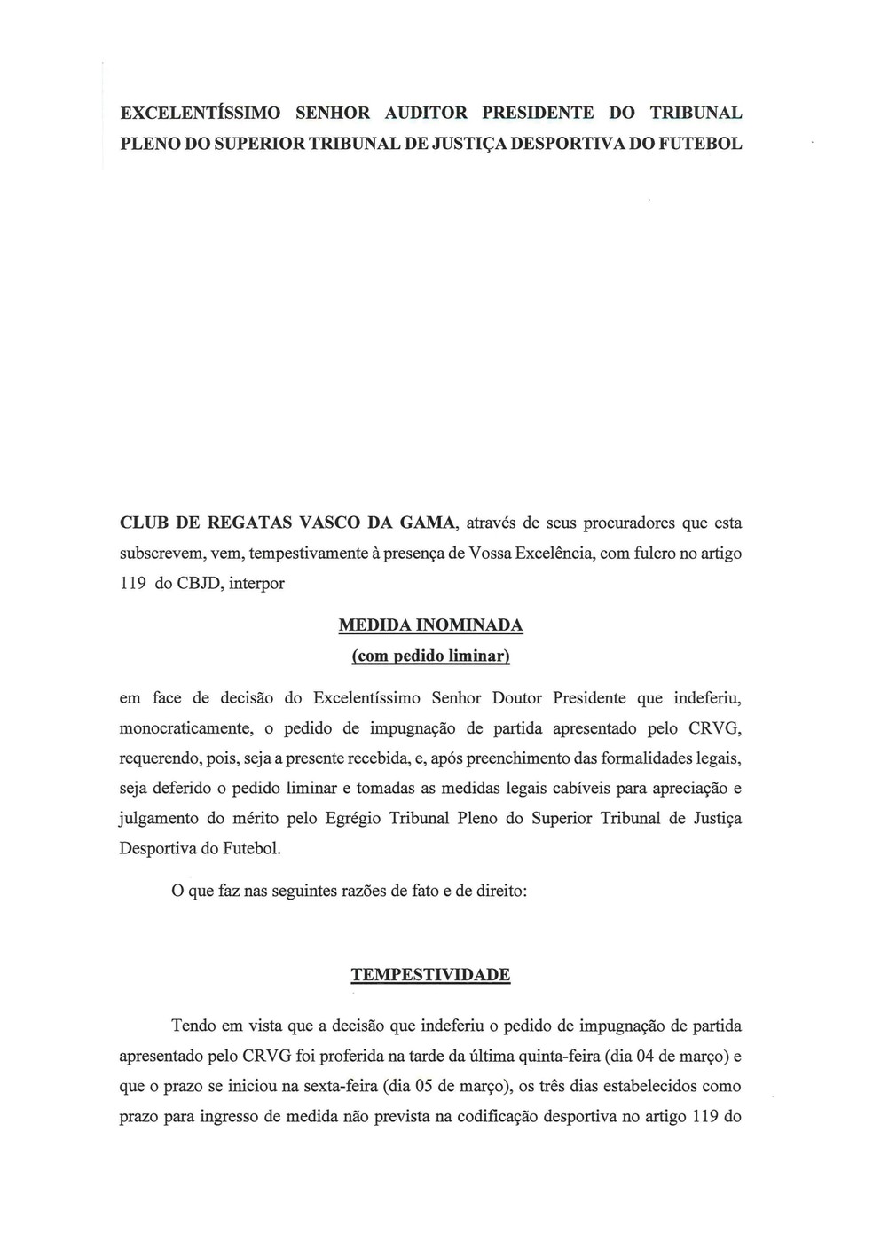 Depois de ter seu pedido de impugnação da partida contra o Internacional - disputada em 14 de fevereiro - indeferido pelo Superior Tribunal de Justiça Desportiva no último dia 4, o Vasco entrou com recurso (medida inominada) para apreciação do Pleno do STJD.