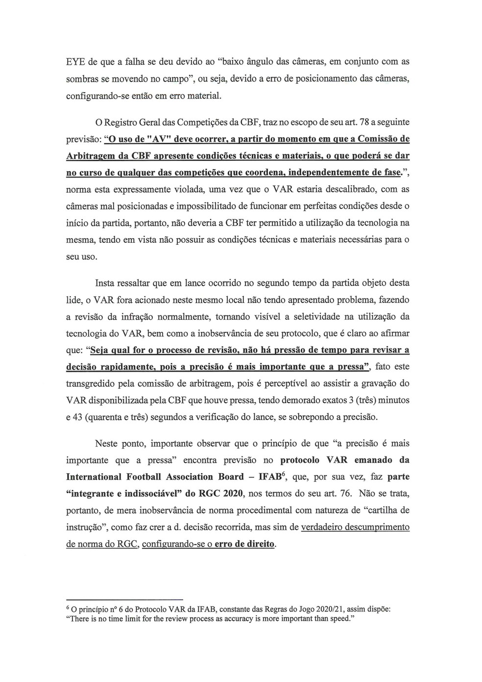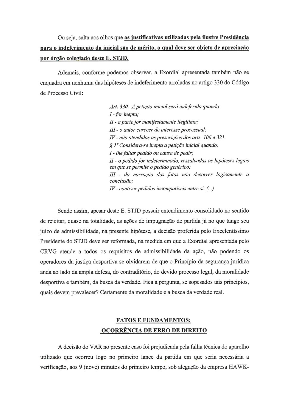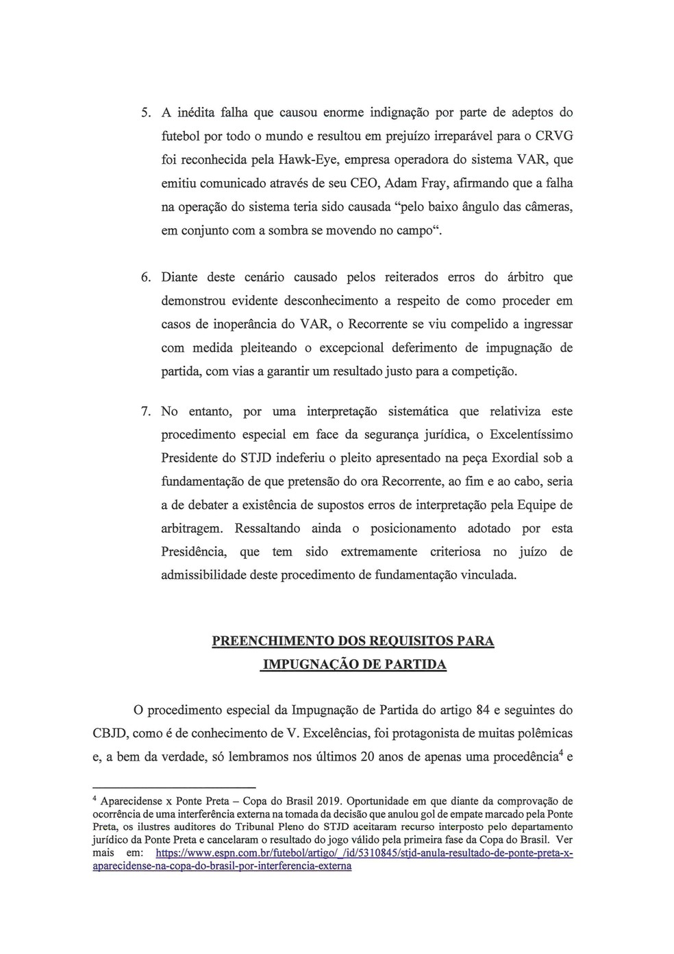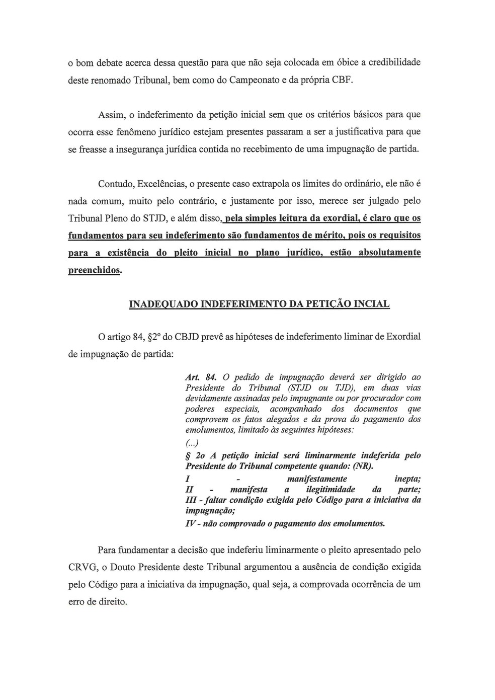 No recurso encaminhado ao Pleno do STJD nesta terça-feira, o Vasco insiste que houve "erro de direito" (leia a partir da página 7 do documento), algo rechaçado pelo presidente do mesmo tribunal, Otávio Noronha, em argumentação utilizada para indeferir o pedido inicial do jurídico vascaíno.