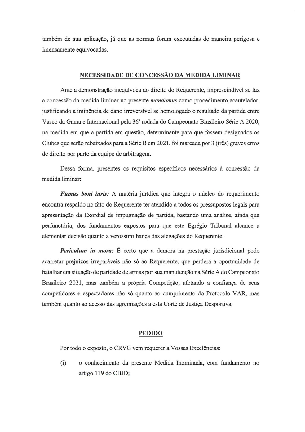 O Vasco tenta a impugnação do jogo pelo fato de o VAR não ter funcionado corretamente no polêmico gol de Rodrigo Dourado, marcado em posição duvidosa, aos nove minutos do primeiro tempo - o Internacional venceu por 2 a 0.
