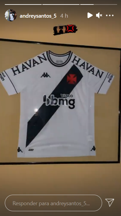 A joia Andrey Santos, que estreou no time profissional do Vasco no dia 6 de março, contra o Volta Redonda, e se tornou o jogador mais jovem a atuar pelo Gigante da Colina no século XXI, transformou a camisa de sua estreia em um quadro, conforme vídeo que publicou no stories de seu Instagram.