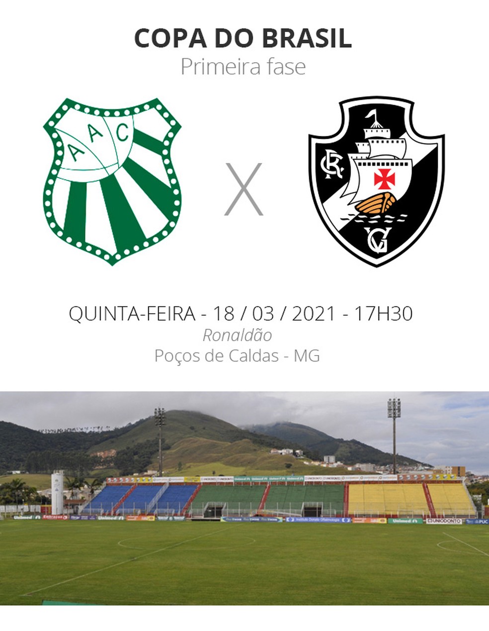 Caldense e Vasco entram em campo nesta quinta-feira (18), às 17h30 (de Brasília) para duelo que vale vaga na próxima fase da Copa do Brasil. As equipes nunca se enfrentaram e fazem o primeiro confronto entre si no Estádio Ronaldão, em Poços de Caldas. A partida é válida pela fase inicial do torneio nacional.