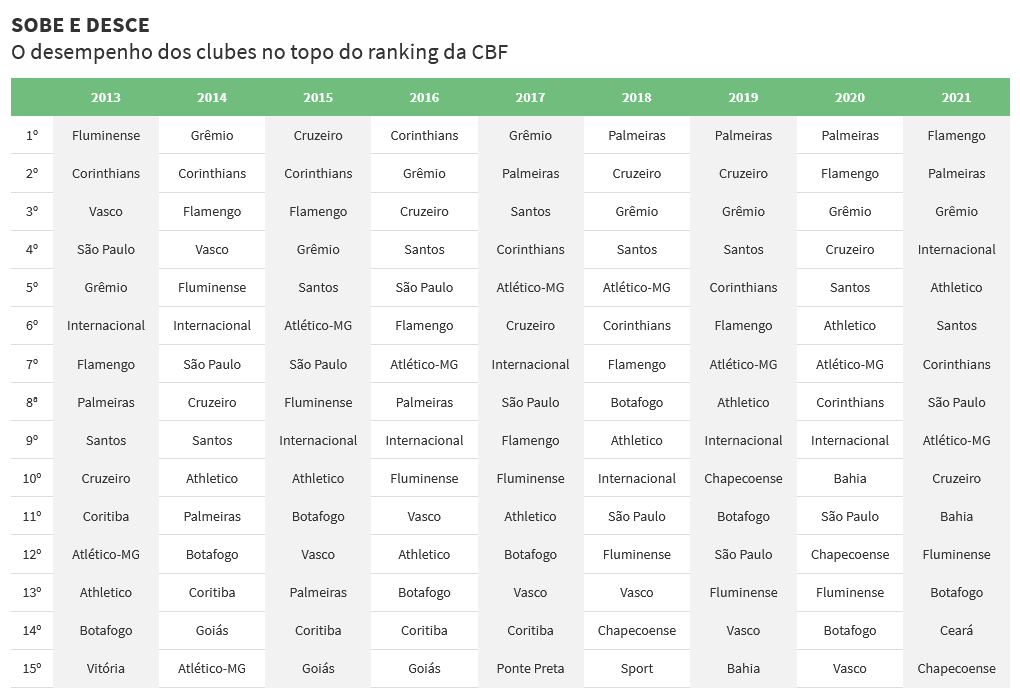 O Vasco é o 16º do ranking. Há oito anos, era o terceiro. Aquele foi seu último momento de protagonismo no cenário nacional. Venceu a Copa do Brasil de dois anos antes e fez boas campanhas nos Brasileiros de 2011 (vice-campeão) e de 2012 (quinto colocado). A partir daí, foram temporadas brigando contra o rebaixamento ou na Série B.