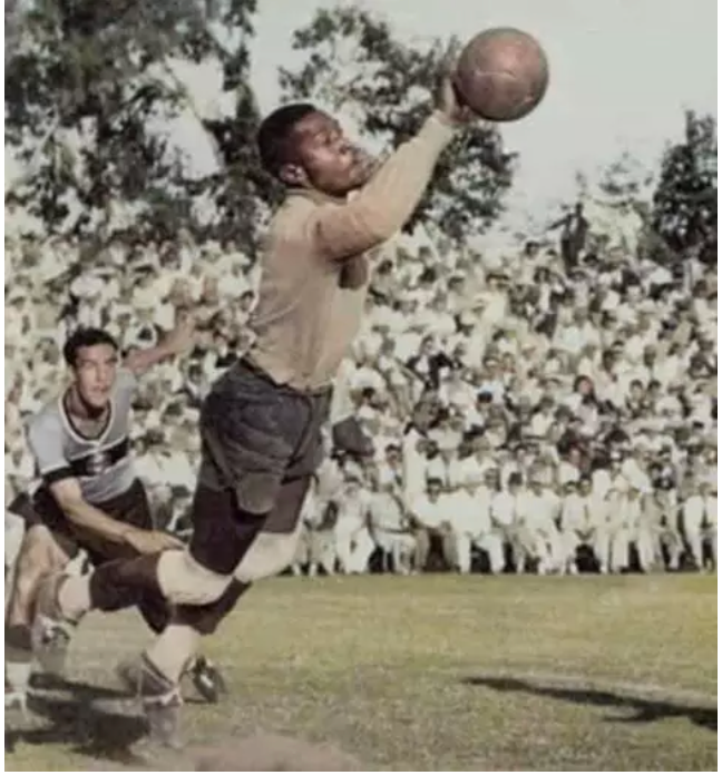 18/03/1945 - Barbosa voa para defender a bola em seu jogo de estreia com a camisa cruzmaltina, há exatos 76 anos, contra o Grêmio. Também observam o lance os vascaínos Raffagnelli (à direita) e Argemiro (à esquerda).
