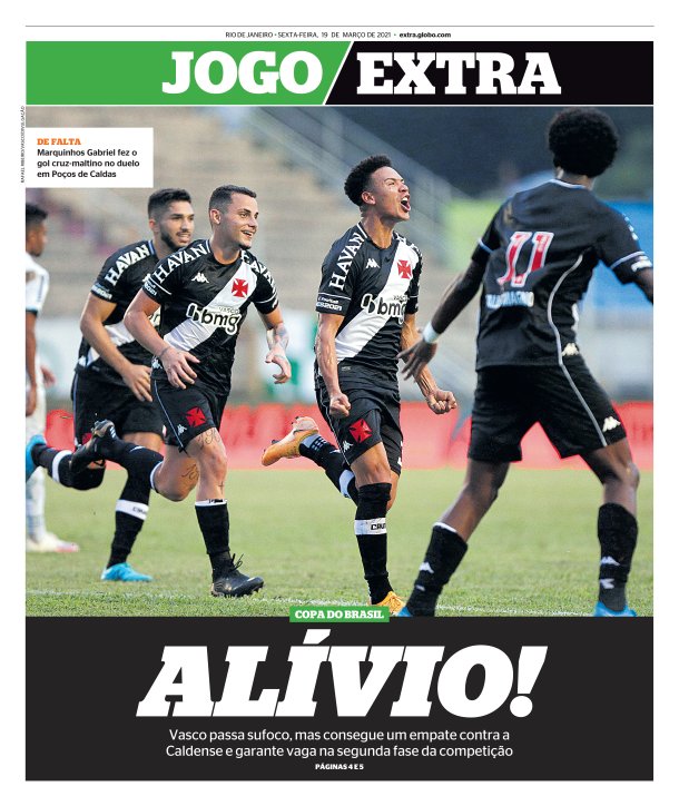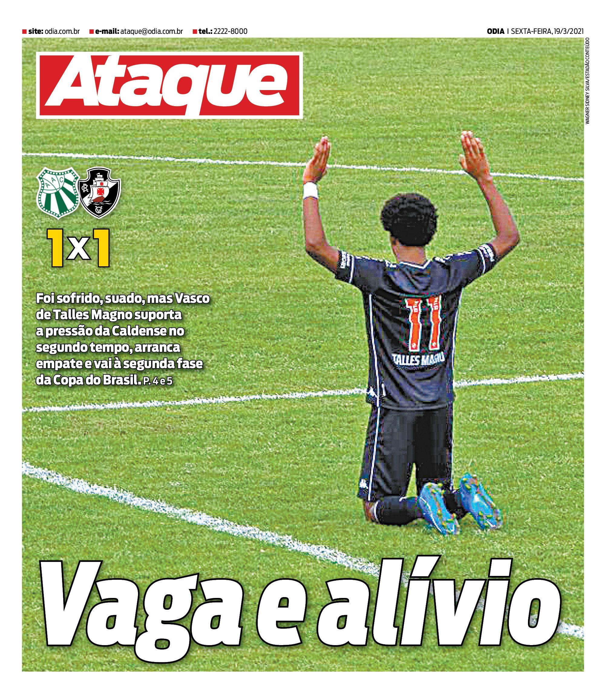 Em sua estreia na Copa do Brasil, o Vasco empatou com a Caldense-MG por 1 a 1 na noite de quinta-feira em Poços de Caldas e avançou para a 2ª fase da Copa do Brasil. Veja as capas.