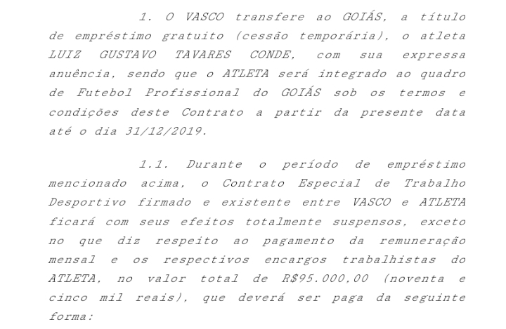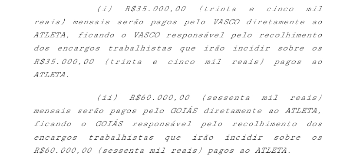 "Como se observa, "o Contrato Especial de Trabalho Desportivo firmado e existente entre VASCO e ATLETA ficará com seus efeitos totalmente suspensos, exceto no que diz respeito ao pagamento da remuneração mensal e os respectivos encargos trabalhistas do ATLETA", observou a juíza.