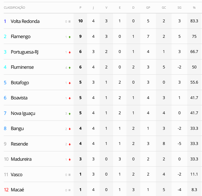 Veja a classificação da Taça Guanabara após os jogos de sábado da 4ª rodada. O Vasco está na 11ª colocação e enfrenta o Botafogo neste domingo, às 18h, em São Januário.