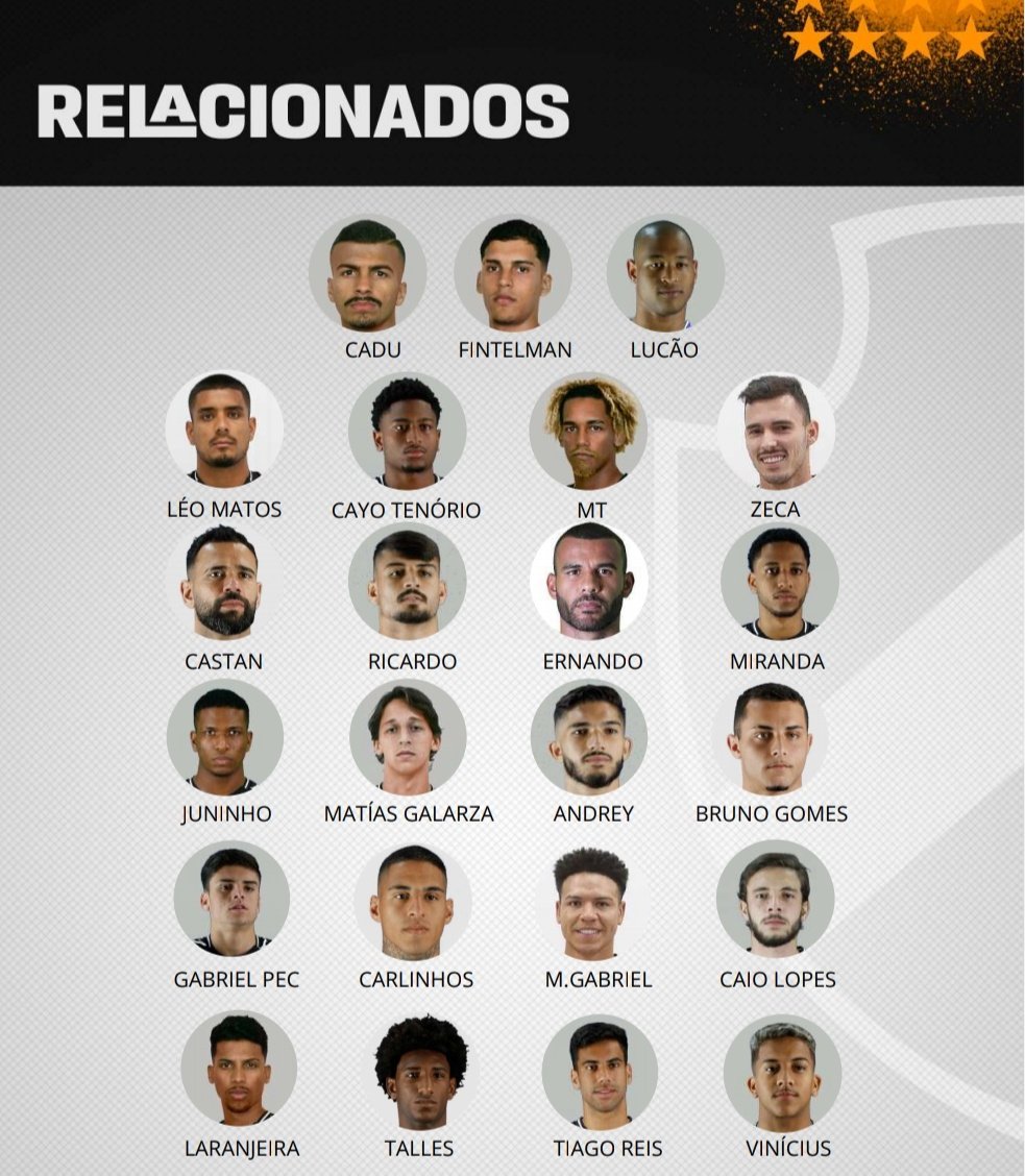 Os relacionados do Vasco para o clássico contra o Botafogo. Cano não foi relacionado porque passará por um 'processo de recondicionamento visando a recuperação de sua plenitude física'. #VascoENM