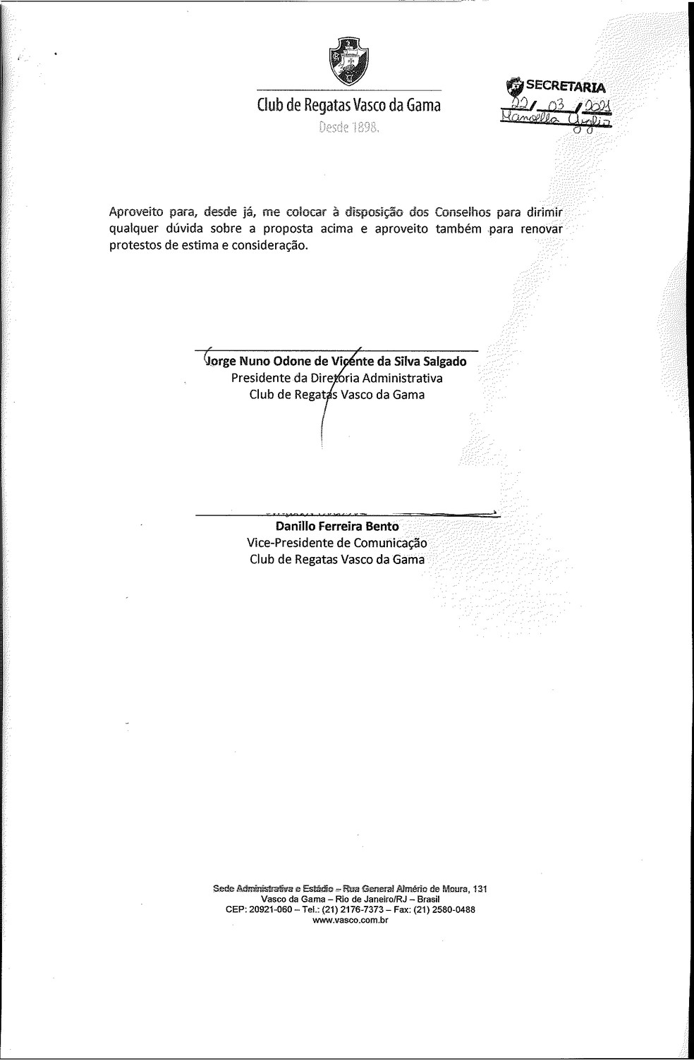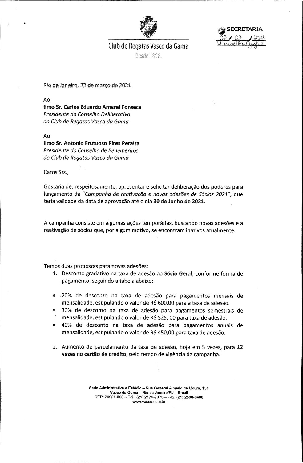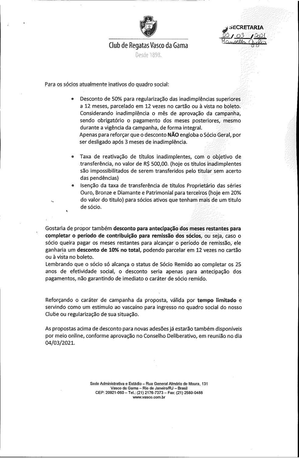 O presidente do Vasco, Jorge Salgado, encaminhou na segunda-feira aos conselhos Deliberativo e de Beneméritos proposta que trata da "Campanha de reativação e novas adesões de sócios" para o ano de 2021. No documento, assinado por Salgado e por Danillo Bento, vice de comunicação, descontos para novas associações e para regularização de inadimplentes são anunciados.
