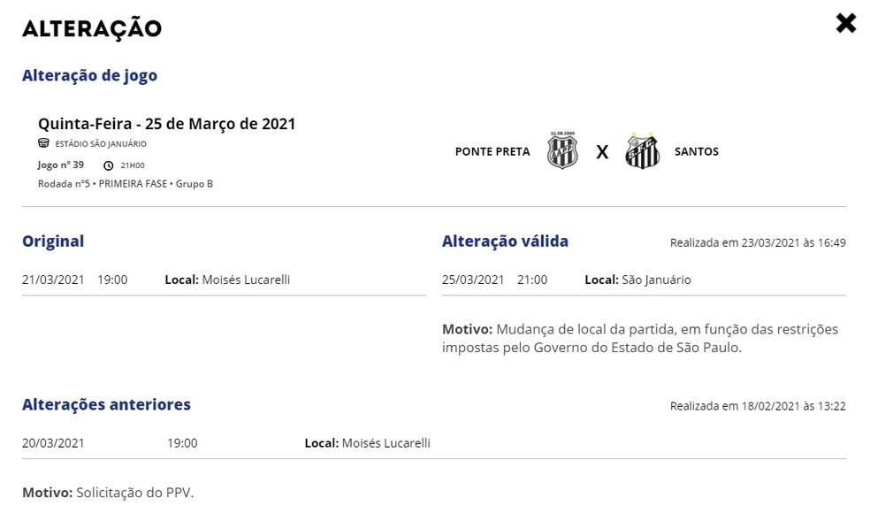 "A Federação Paulista de Futebol informa que o jogo Ponte Preta x Santos, válido pela rodada 5 do Paulistão Sicredi 2021, será realizado nesta quinta-feira (25), às 21h, no estádio São Januário, no Rio de Janeiro, após acordo com o Governo do Estado do Rio, com a Prefeitura do Rio e com a Federação de Futebol do Estado do Rio de Janeiro.
