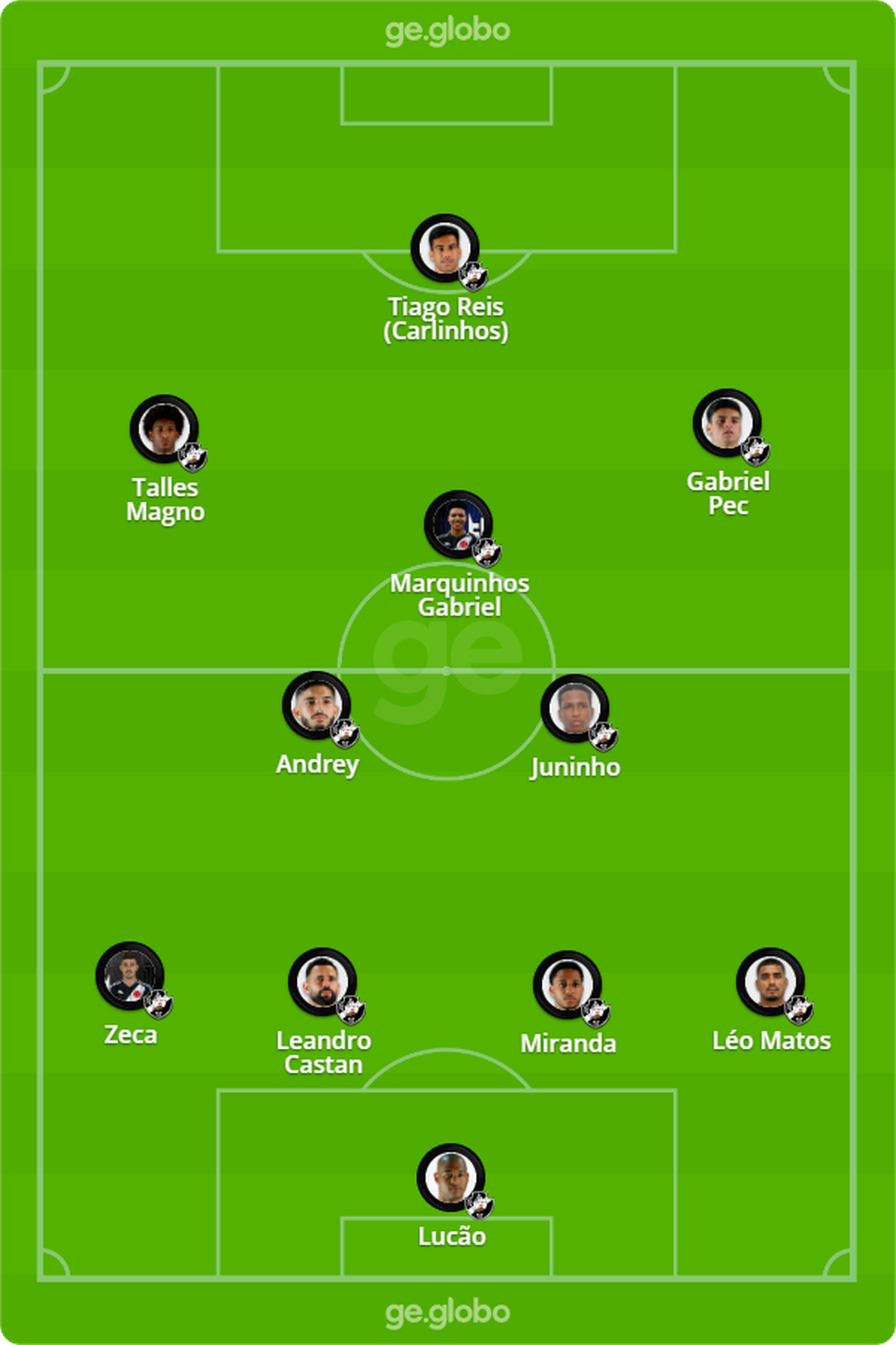 Provável escalação: Lucão, Léo Matos, Miranda, Leandro Castan e Zeca; Andrey, Juninho e Marquinhos Gabriel; Talles Magno, Gabriel Pec e Tiago Reis (Carlinhos).