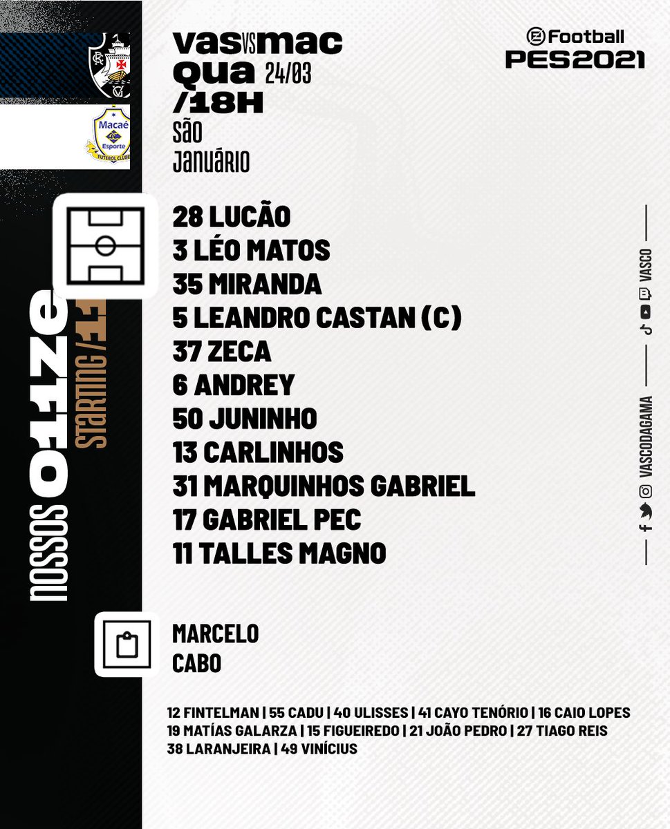 Confira a escalação do Vasco para o jogo contra o Macaé; Miranda, Castan, Juninho e Carlinhos são titulares