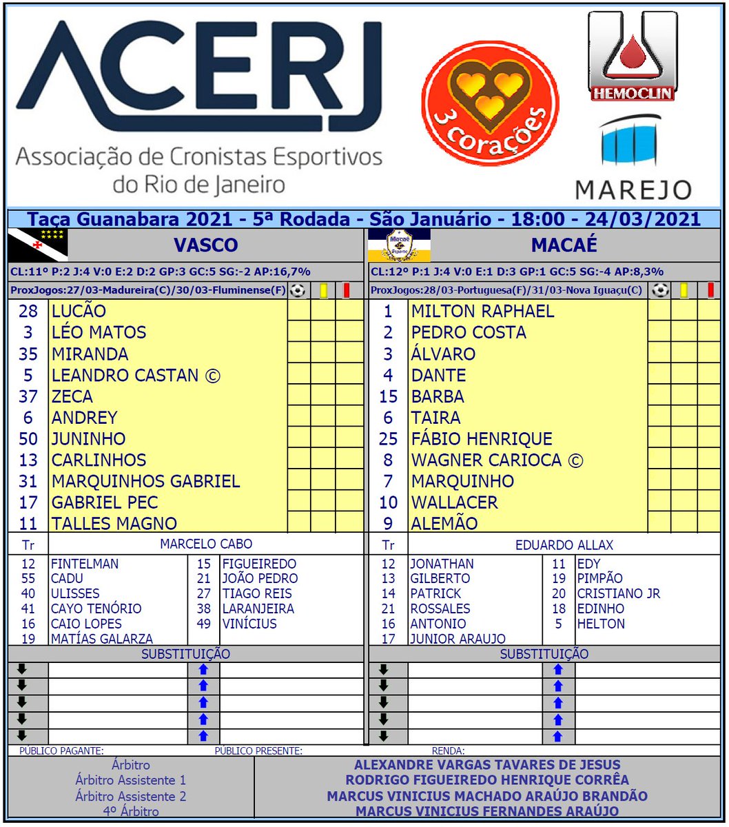 Escalações de Vasco e Macaé pela 5ª Rodada da Taça Guanabara 2021 em São Januário #Cariocão2021 #acerjinforma #VASxMAC