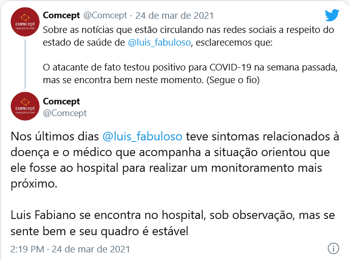 Nas redes sociais, a assessoria do jogador emitiu uma nota confirmando a internação e esclarecendo a situação.
