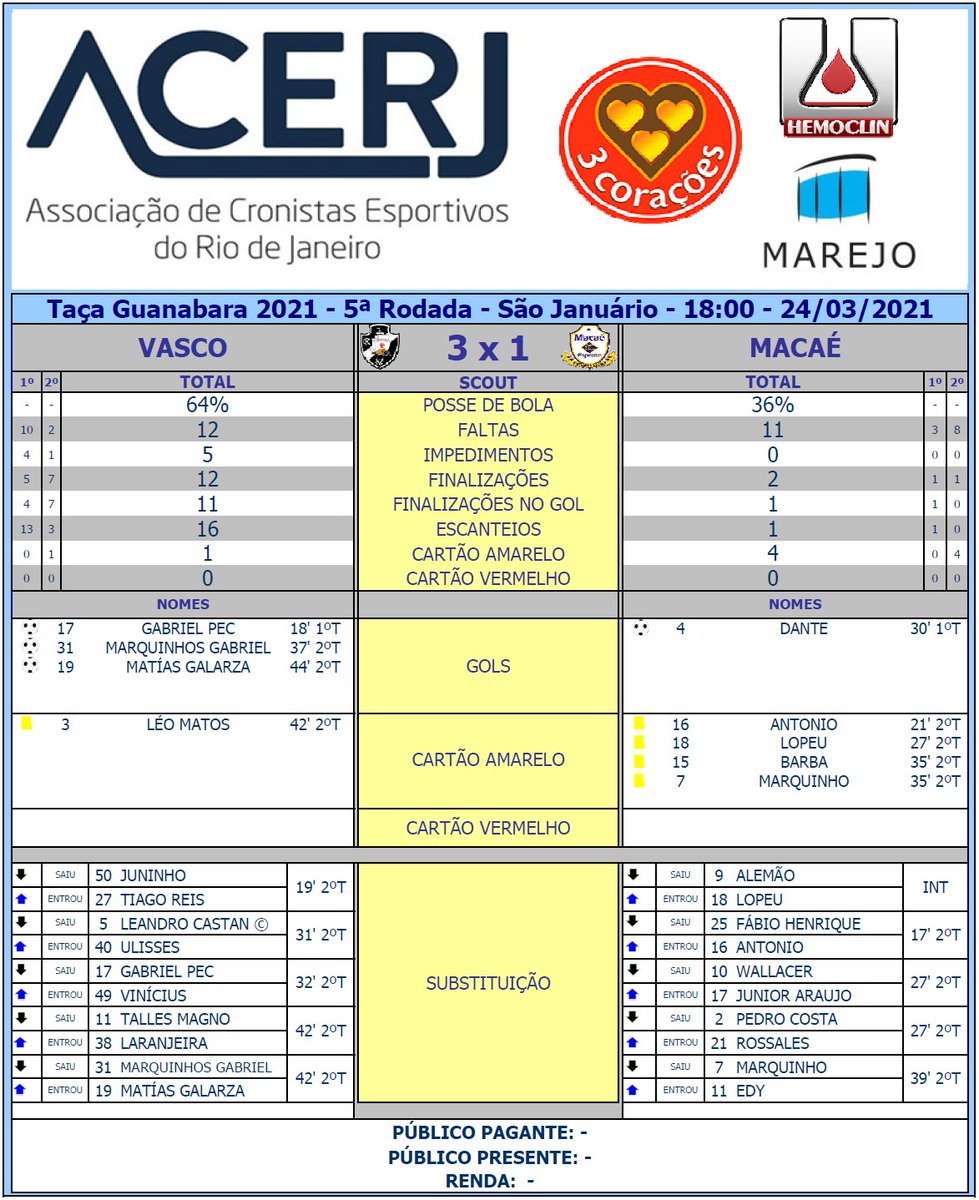 O Vasco dominou o primeiro tempo e abriu o placar com Gabriel Pec. Só que o Macaé empatou com Dante ainda na etapa inicial. No segundo tempo, os donos da casa chegaram a vitória com gols Marquinhos Gabriel, de pênalti, e Matías Galarza.