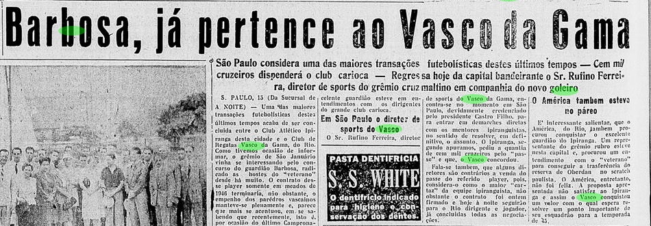Veja notícia do jornal A Noite de 1945 sobre chegada de Barbosa ao Vasco