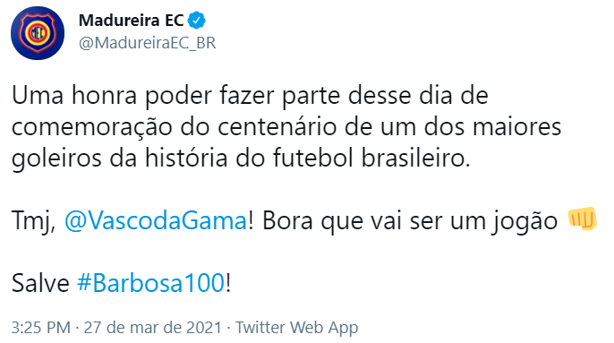 Madureira: 'Uma honra poder fazer parte desse dia de comemoração do centenário de um dos maiores goleiros da história do futebol brasileiro'