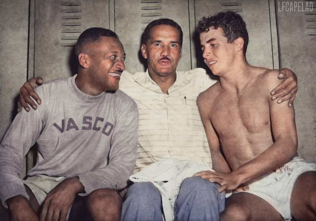 Veja versão colorizada de foto histórica de Barbosa com o técnico Gradim e Almir Pernambuquinho