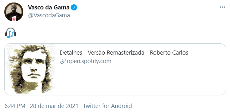 Twitter do Vasco publica link para a música 'Detalhes', de Roberto Carlos