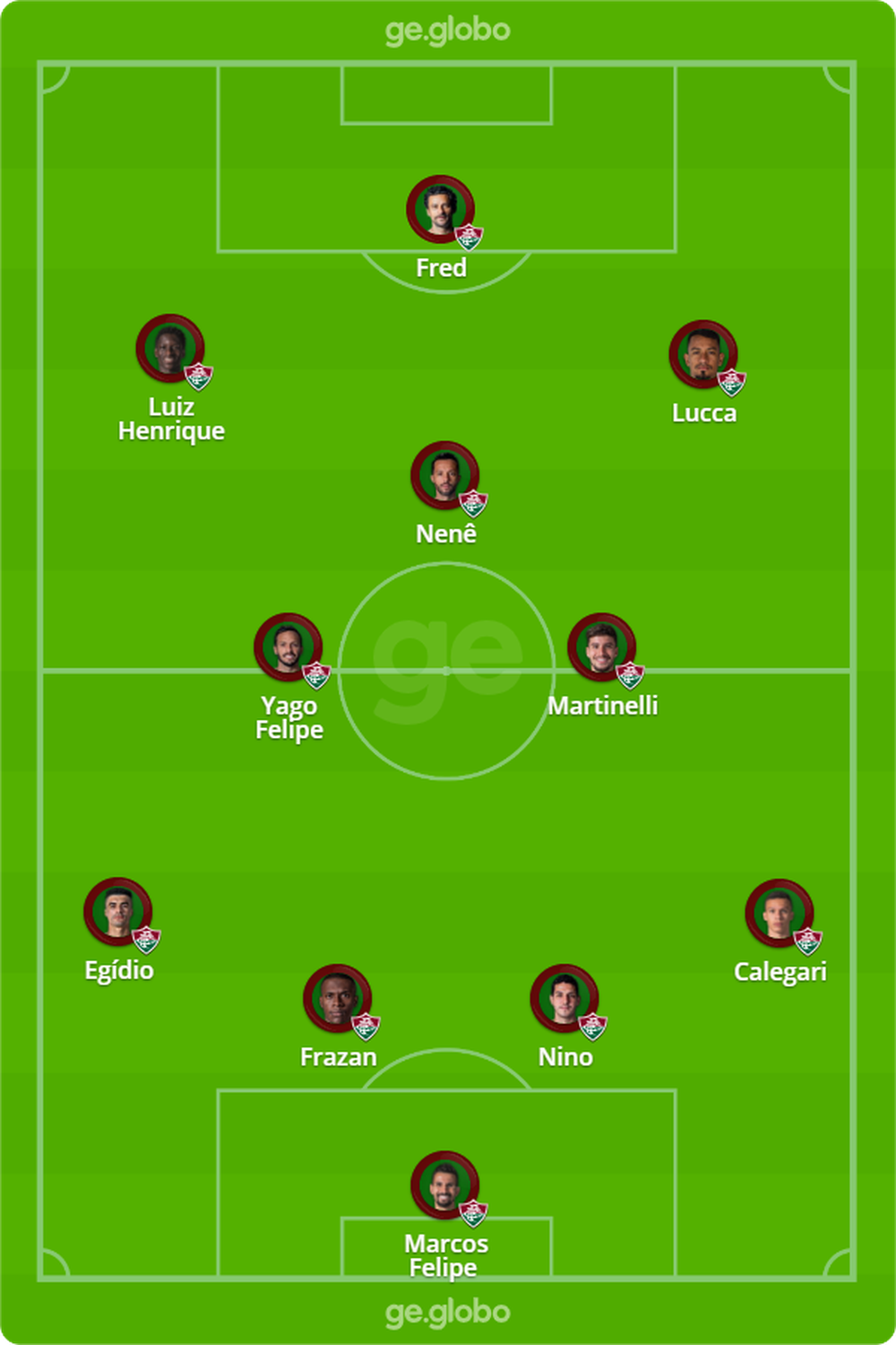 Provável escalação: Marcos Felipe; Calegari, Nino, Frazan e Egídio; Martinelli, Yago (Wellington) e Nenê; Luiz Henrique, Lucca e Fred.