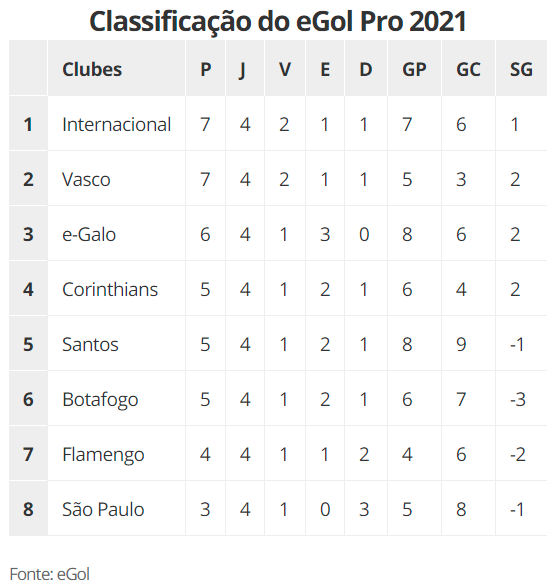 E-Sports: Após 4 rodadas, Vasco está em 2º lugar no eGol Pro, empatado em pontos com o líder Inter