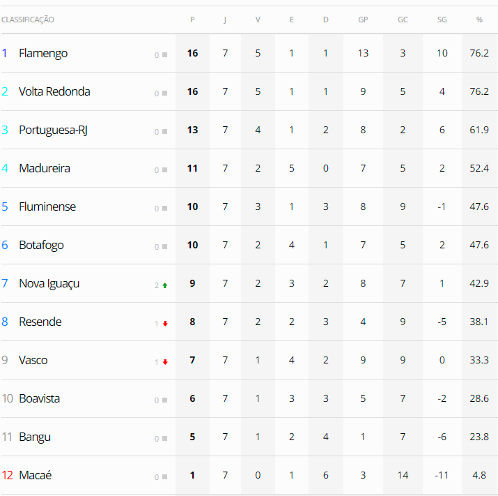 Terminada a 7ª rodada da Taça Guanabara, o Vasco, que empatou com o Fluminense por 1 a 1, caiu da 8ª para a 9ª posição. O Gigante da Colina está a 4 pontos do G4 e a 6 pontos do 12º colocado, que será rebaixado para a Série A2 ao fim da competição.
