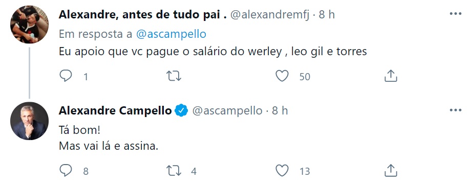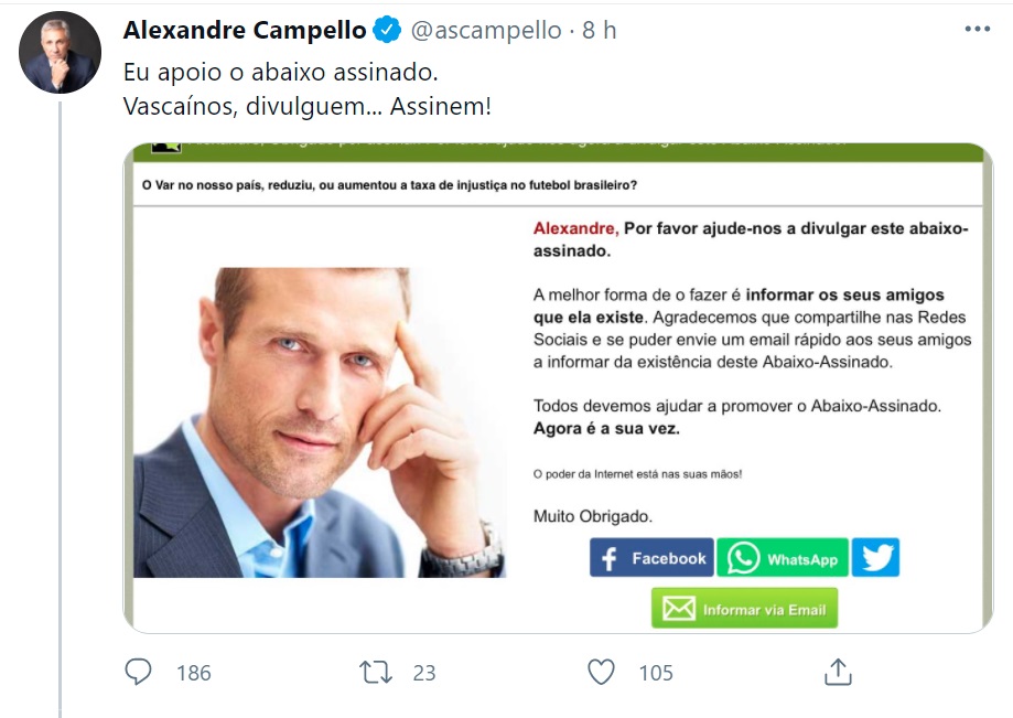 Campello reaparece no Twitter, divulga petição, fala em 'manipulação' em Vasco x Inter e responde torcedores