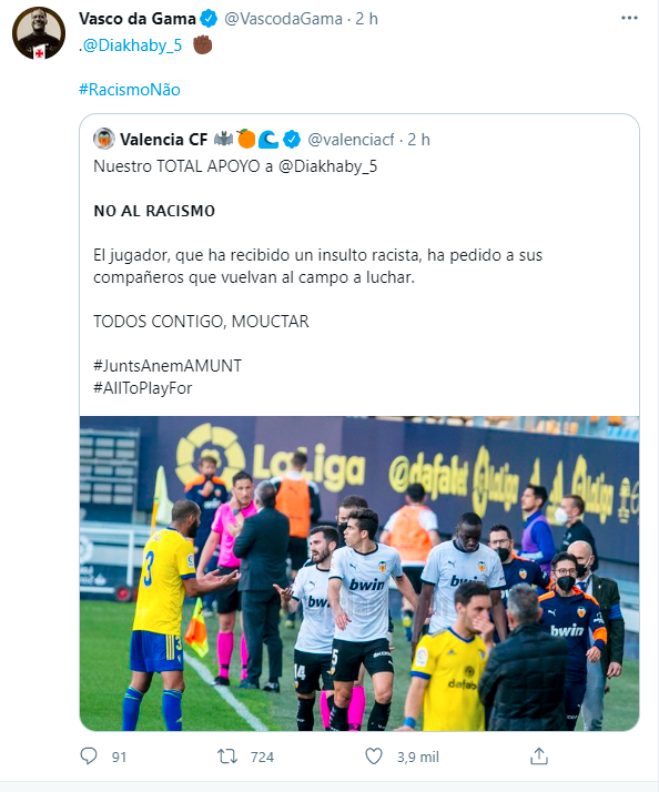 Vasco se manifesta sobre caso de injúria racial sofrido por jogador do Valencia-ESP
